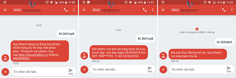 TH3: Mã số không đúng --> Sản phẩm không phải của công ty Vẻ Đẹp Việt phân phối. Khách hàng vui lòng kiểm tra lại xuất xứ nguồn hàng và điểm bán.