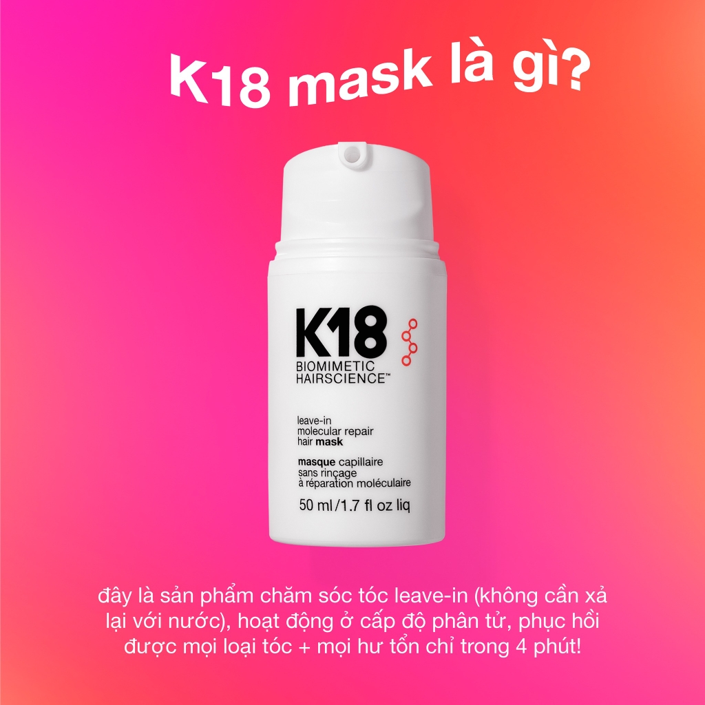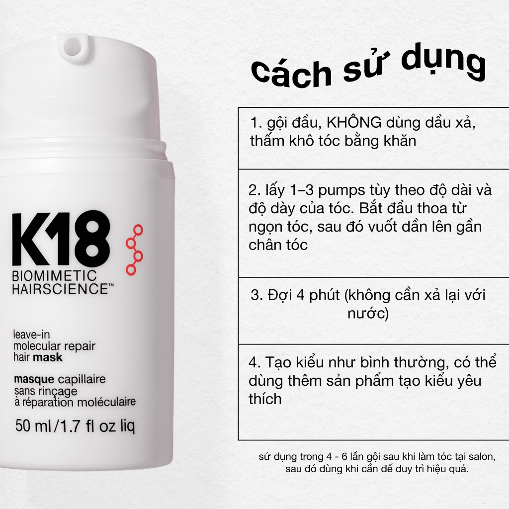 Mặt nạ tóc trị liệu không cần xả hoạt động ở cấp độ phân tử để phục hồi tóc hư tổn chỉ trong 4 phút. K18PEPTIDE™ đã được chứng minh lâm sàng có khả năng sửa chữa hư tổn từ tẩy tóc, nhuộm, dịch vụ hóa chất và nhiệt – mang lại kết quả ngay lập tức và lâu dài để phục hồi sức mạnh, sự mềm mại, mượt mà và độ nẩy của tóc.